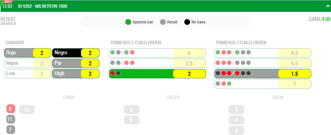 | Ganador | Predecir el participante (caballos) que finalizará la carrera en primer lugar o posición. Siendo: "Rojo" si el participante que finalizará la carrera en primer lugar o posición tiene asignado el color rojo. "Negro" si el participante que finalizará la carrera en primer lugar o posición tiene asignado el color negro. "Impar" si el participante que finalizará la carrera en primer lugar o posición tiene asignado un número impar. Si la carrera es de 13 participantes, los números impares serán: 1, 3, 5, 7, 9 o 11. Si la carrera es de 11 participantes, los números impares serán: 1, 3, 5, 7 u 9. Si la carrera es de 9 participantes, los números impares serán: 1, 3, 5 u 7. "Par" si el participante que finalizará la carrera en primer lugar o posición tiene asignado un número par. Si la carrera es de 13 participantes, los números pares serán: 2, 4, 6, 8, 10 u 12. Si la carrera es de 11 participantes, los números pares serán: 2, 4, 6, 8 u 10. Si la carrera es de 9 participantes, los números pares serán: 2, 4, 6 u 8. "Low" si el participante que finalizará la carrera en primer lugar o posición tiene asignado alguno de los siguientes números: Si la carrera es de 13 participantes, los números "low" serán: 1, 2, 3, 4, 5 u 6. Si la carrera es de 11 participantes, los números "low" serán: 1, 2, 3, 4 o 5. Si la carrera es de 9 participantes, los números "low" serán: 1, 2, 3 o 4. "High" si el participante que finalizará la carrera en primer lugar o posición tiene asignado alguno de los siguientes números: Si la carrera es de 13 participantes, los números "high" serán: 7, 8, 9, 10, 11 u 12. Si la carrera es de 11 participantes, los números "high" serán: 6, 7, 8, 9 u 10. Si la carrera es de 9 participantes, los números "high" serán: 5, 6, 7 u 8. El participante con número asignado 0 y color verde, está excluido para esta combinación. |